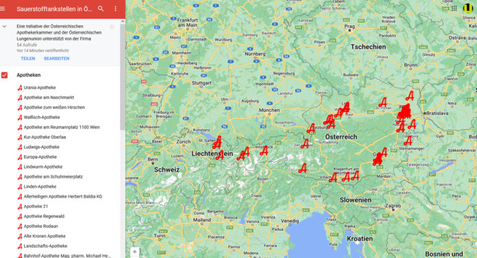 Interaktive Karte mit dem österreichischen Sauerstoff-Tankstellennetz in Apotheken: